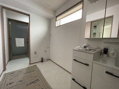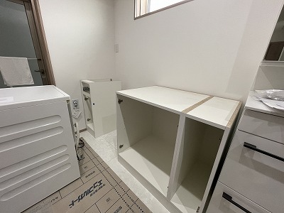 洗面脱衣室のこちらのスペースに設置します。キャビネットもオーダーで作成させていただきました。