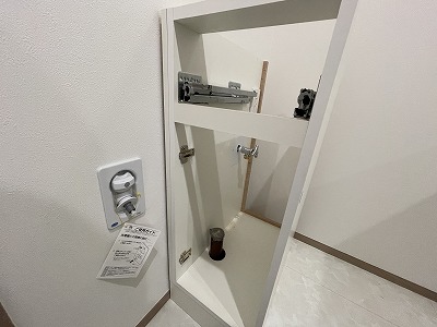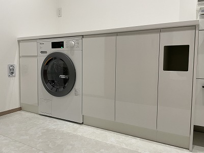 奥から ・ミーレ洗濯乾燥機用配管スペース ・収納 ・ゴミ箱スペース になります。