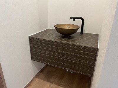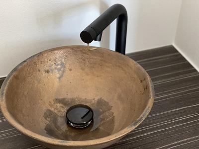 お施主様がどうしても使いたかったという常滑焼の洗面ボウルをお施主様支給していただき、取付させていただきました