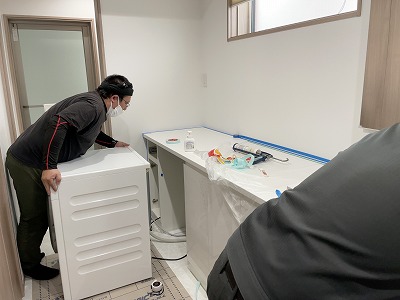 天板を取り付けたら、いよいよ洗濯乾燥機を搬入!キャビネット内へ組み込んでいきます。