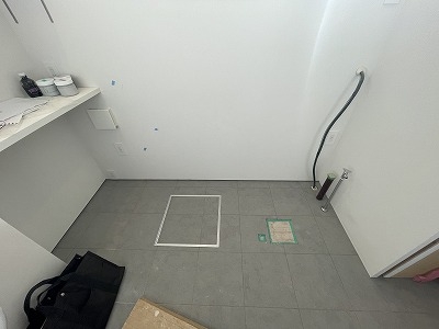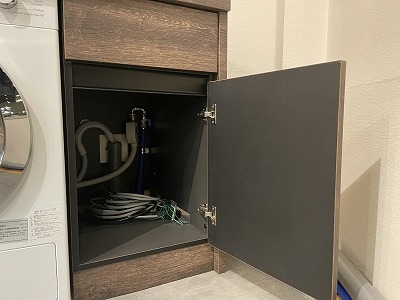 右の壁際に給排水管と洗濯機用の電源、左のカウンター下に衣類乾燥機用の電源をご用意していただきました。