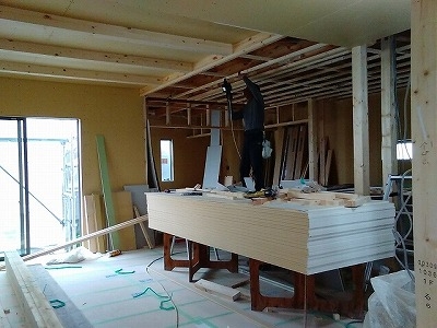 室内では大工さんが天井組みをしています。私も天井の作業をしたことがありますが方向感覚がなくなるわ首は痛いわでとても無理です、、。