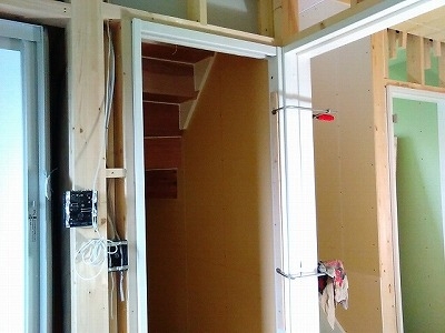 階段下収納の建具の枠と枠が接合するところ、そして左にスイッチボックスをギリギリに入れて開口を可能な限り確保します。OKです!