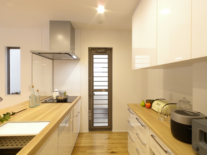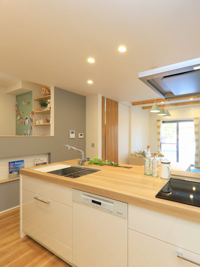 手前のオリジナルキッチンは木目調のメラミン天板とミーレ食洗器がポイント。
