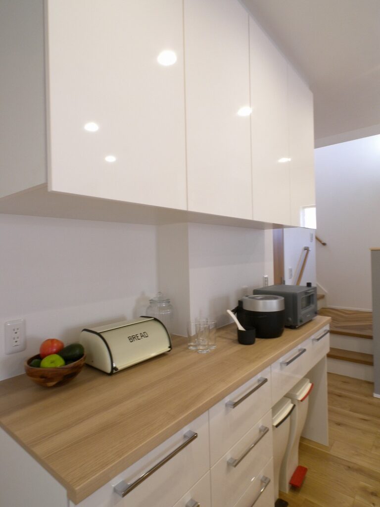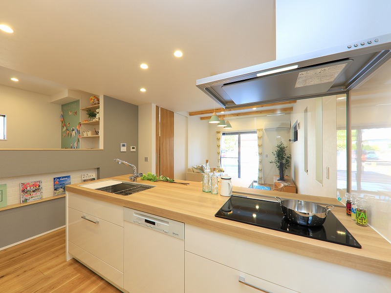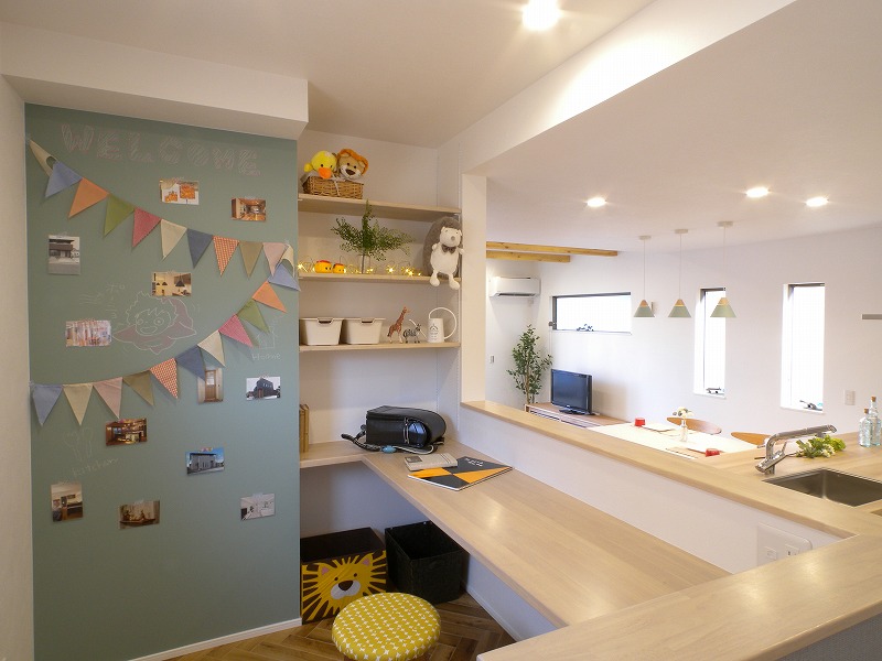 LDKから見えるところにワークスペースがあり、お子さんが勉強している横でお母さんが家事を行います。