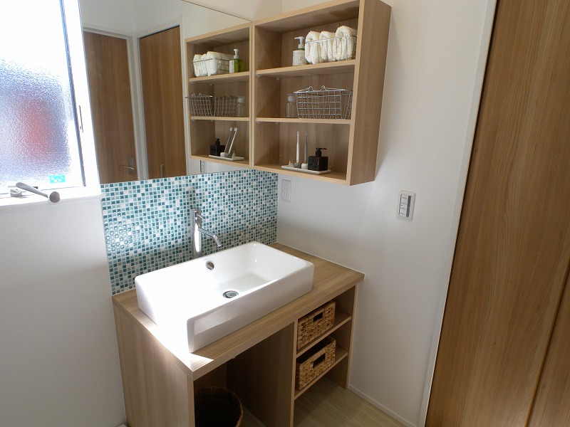 ターコイズブルーのモザイクタイルはナチュラルの内観のなかでアクセントになります。