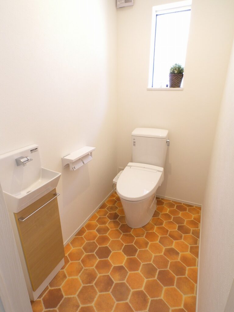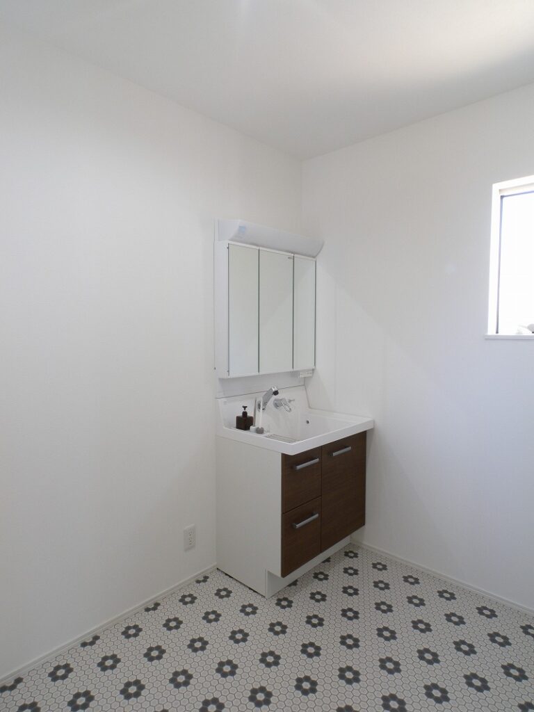 サニタリースペースにはお施主様がチョイスした可愛らしい柄のフロア材を使用しました。