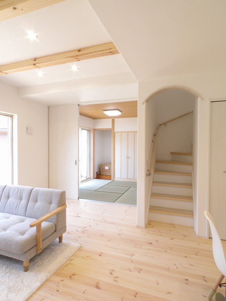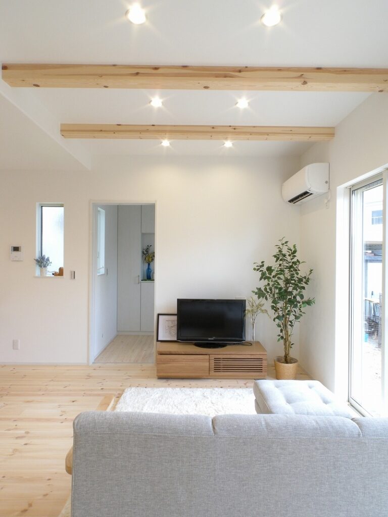 リビング床にはあたたかみのあるパイン無垢フローリングを採用しています。