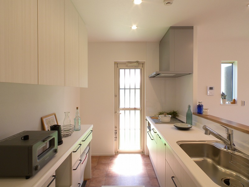 弊社オリジナルのオーダーキッチン。キッチン廻りはテラコッタ風のフロア材にしました。