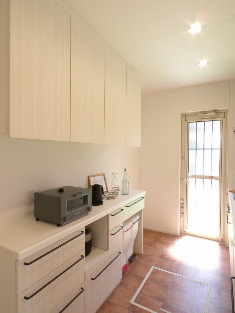 カップボードもオーダーで作成。ゴミ箱スペースも設けました。