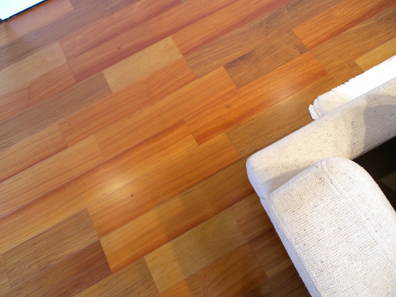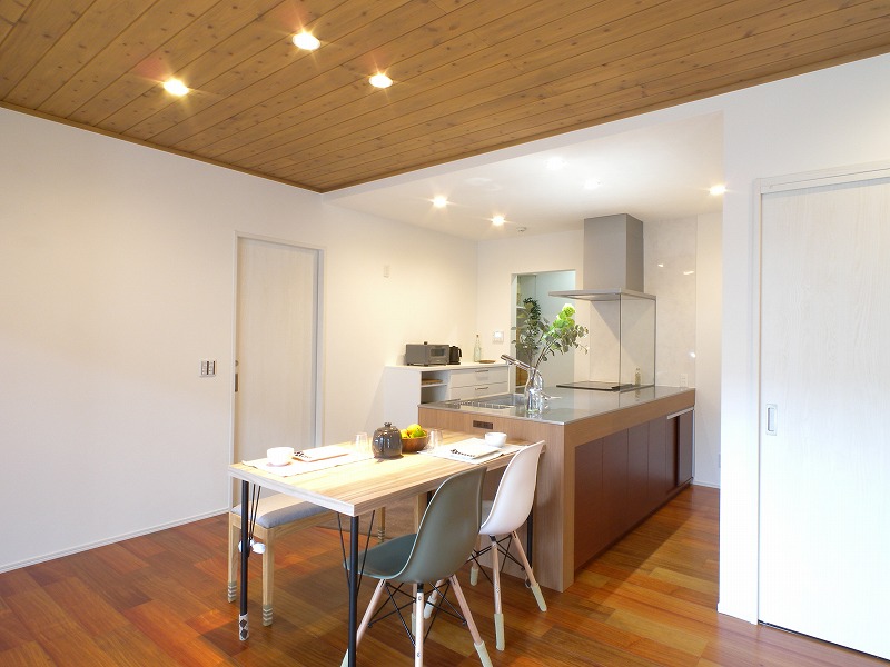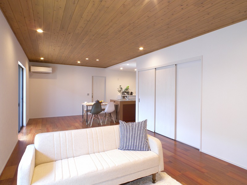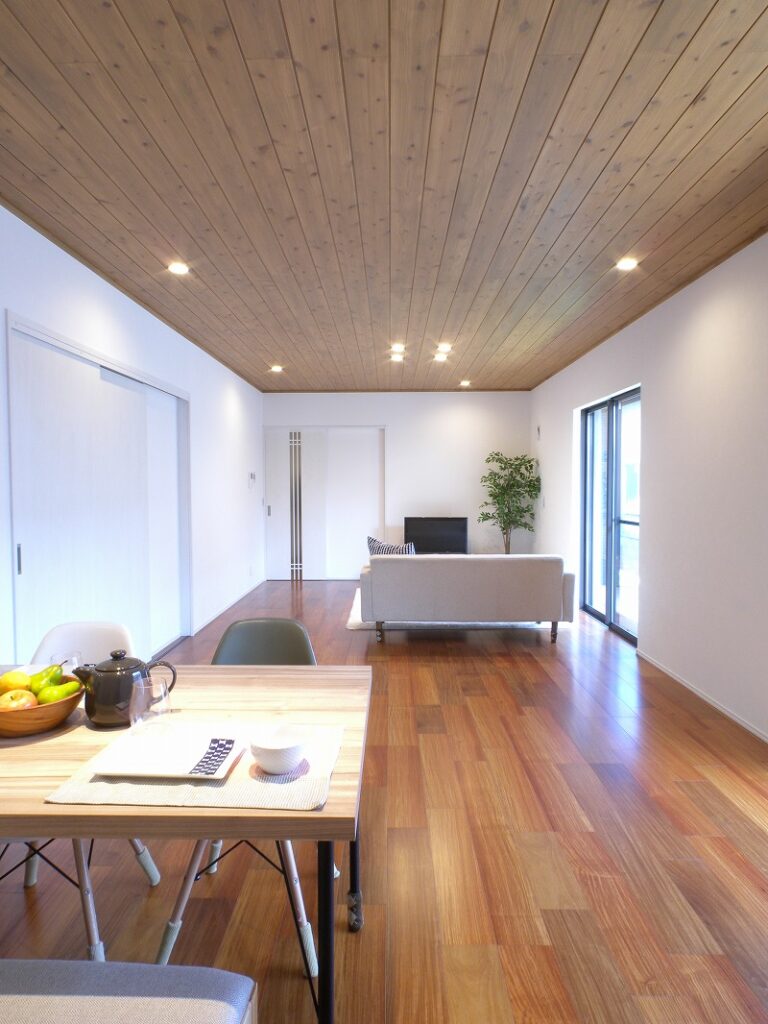 平屋ならではの大空間LDK。床はカリン、天井は無垢板張りで仕上げ、木のぬくもりが感じられるあたたかな空間です。