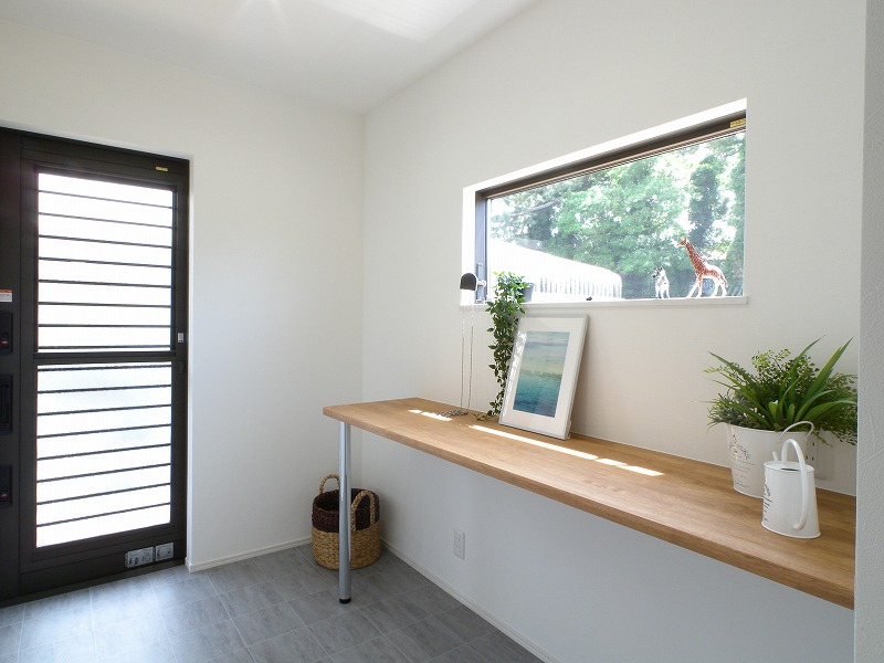 物干しスペースを設けました。雨や花粉の季節でもこちらで洗濯物を干すことができます。壁面にはアイロンがけなど立って作業のできる高さにカウンターを設けました。