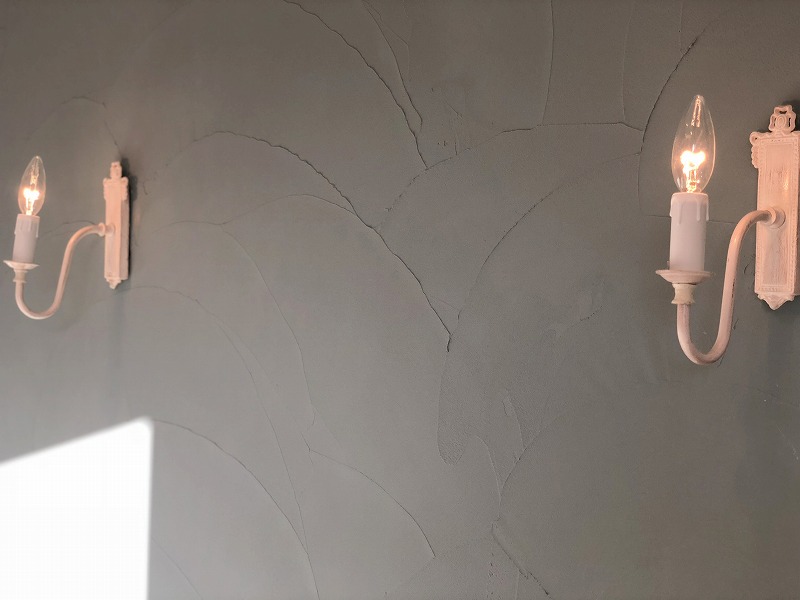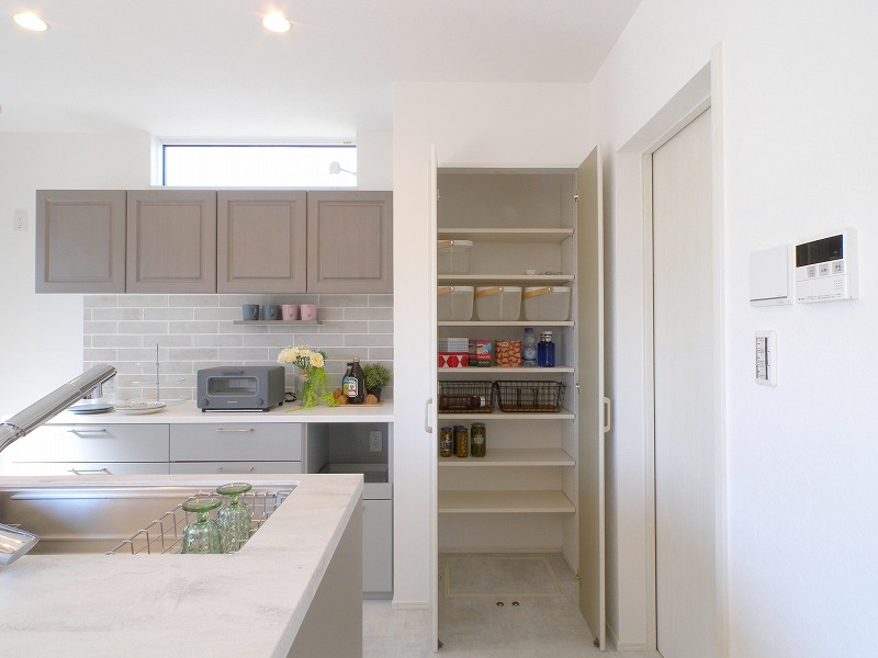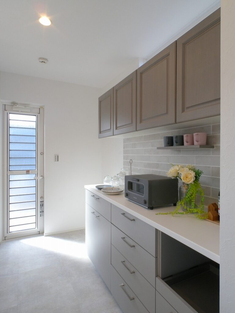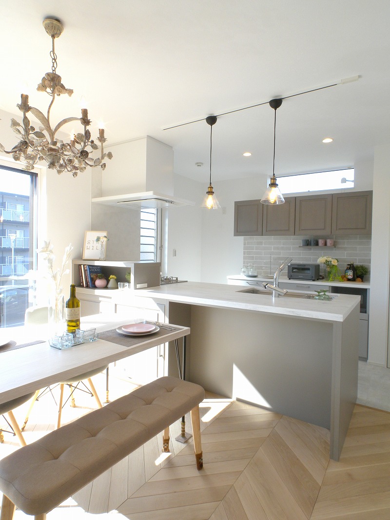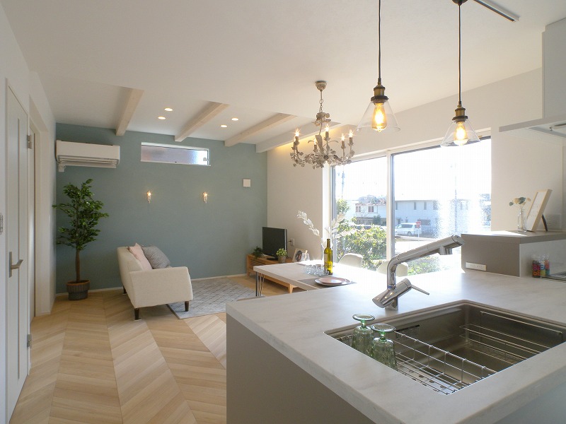 マテリアル感が素敵なこのお家のこだわりは、ヘリンボーン柄の無垢床、塗り壁アクセント、コーリアンのキッチン天板、ブルーグレーに塗装したキッチン框組み扉、そして壁タイル。装飾の照明器具も含めて最後までこだわって完成しました。