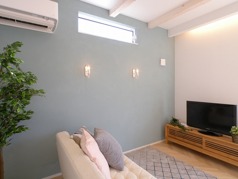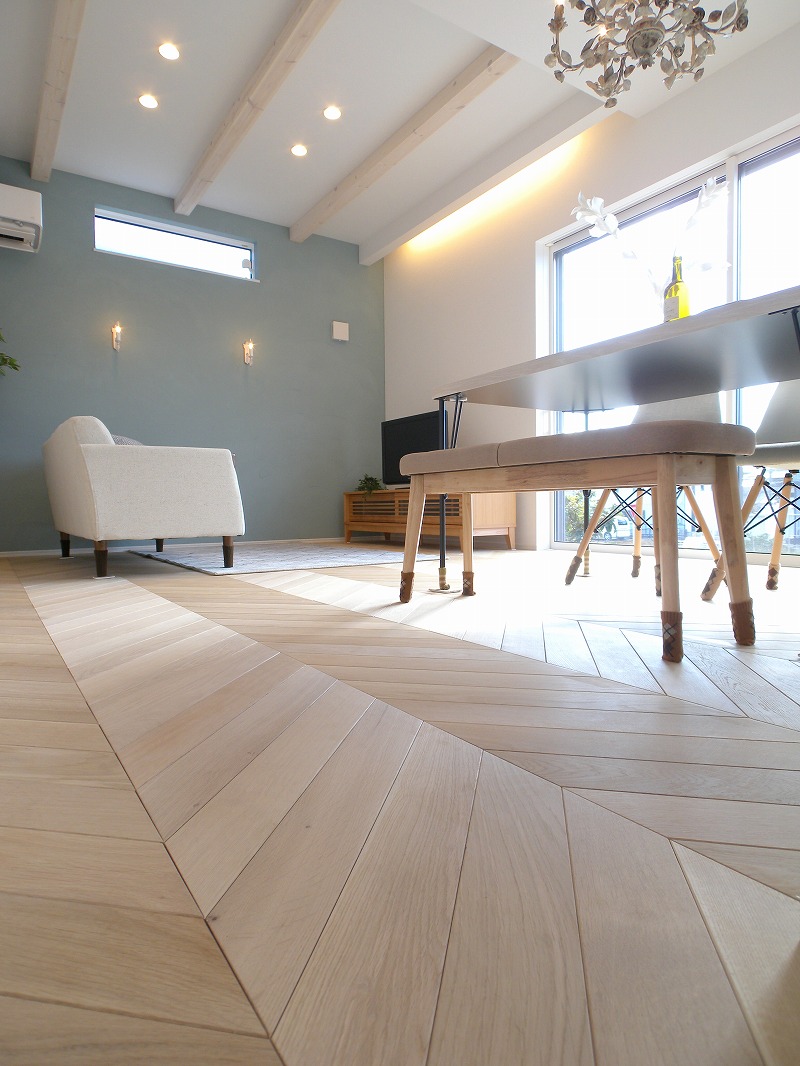 LDKの床にはフレンチヘリンボーン柄の無垢材を採用。壁はブルーグレーの塗り壁が質感ともに良質なアクセントに。