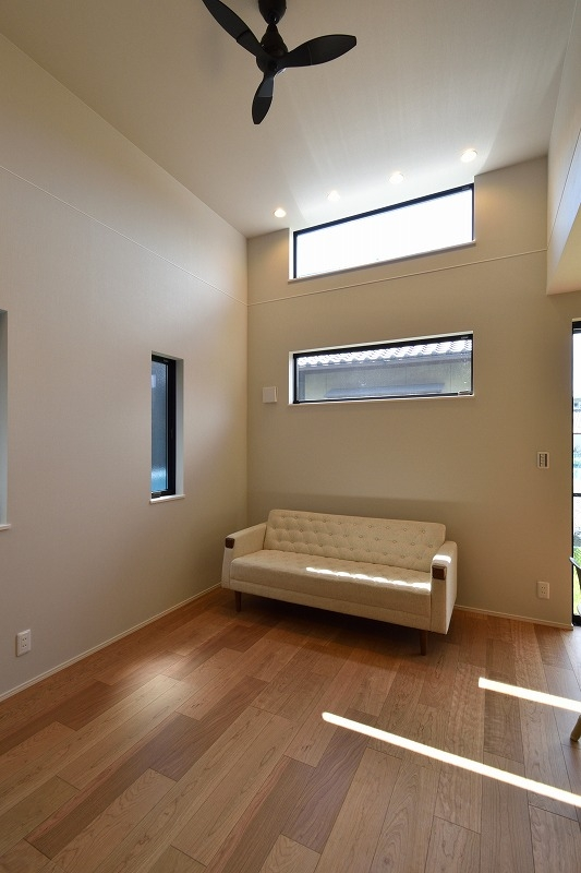 南側の光をたっぷりと取り入れる為に、リビングは天井の高さを標準より1m高く設計した高天井を採用しています。