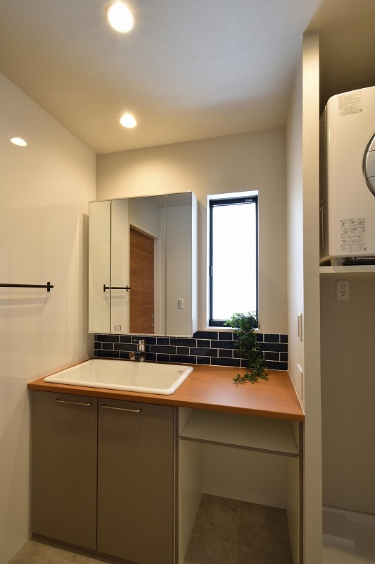 洗面化粧台は、幅135㎝の広々設計。深型のボウルとホース付の水栓で使い勝手も◎