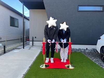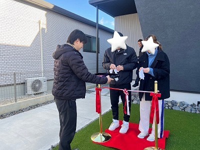 お引渡し式ではお施主様ご家族にテープカットをしていただきます