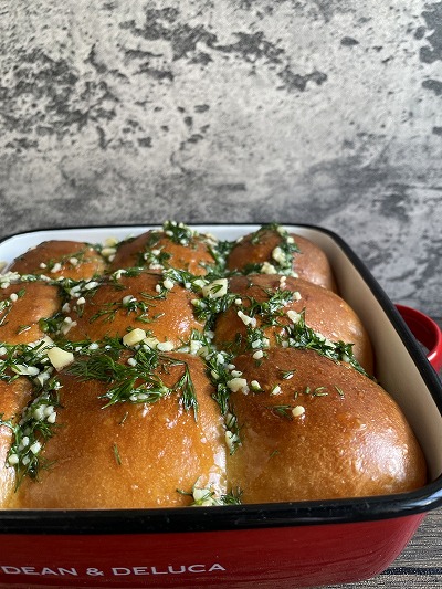 ふんわりパンにガーリックバターをたっぷりかけて仕上げます