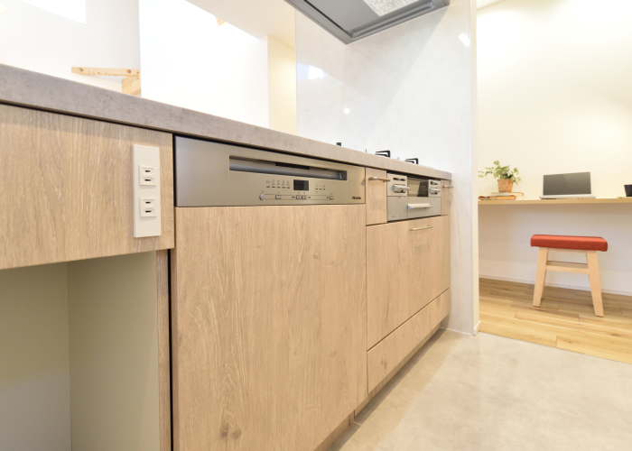 ドイツ製「Miele」の食器洗い機は、キッチンカウンターに組み込んで設置するビルトインタイプ。家事導線をスッキリと整えつつ、雑然としがちなキッチン空間を美しく保ちます。