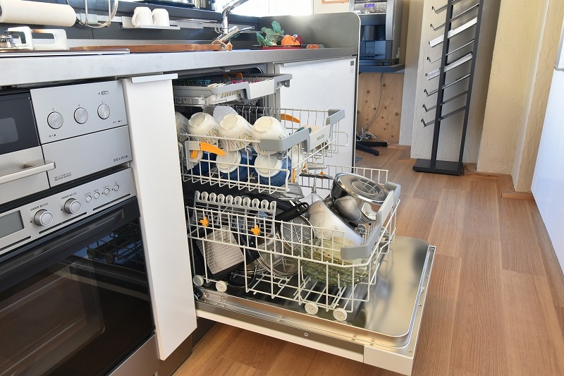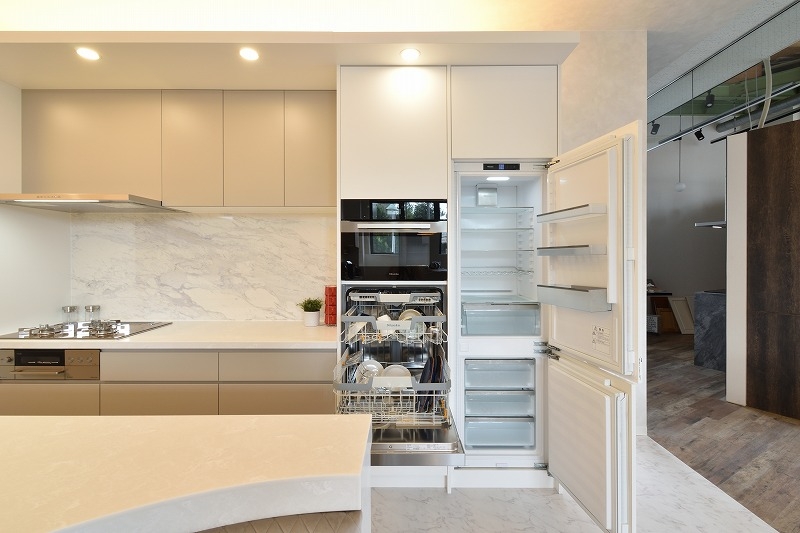 ドイツ製Miele(ミーレ)の食洗機と電子レンジ機能付きオーブン、冷蔵庫をカップボードにビルトイン。