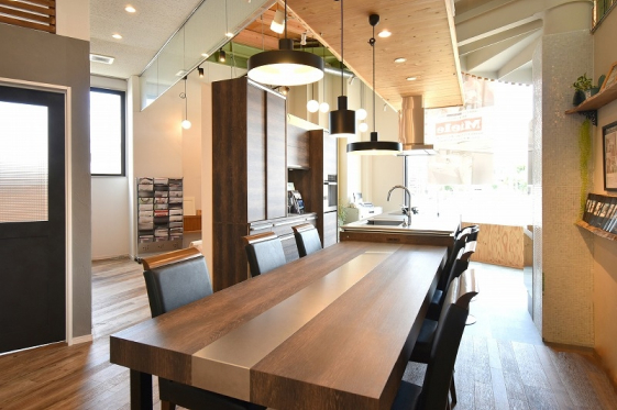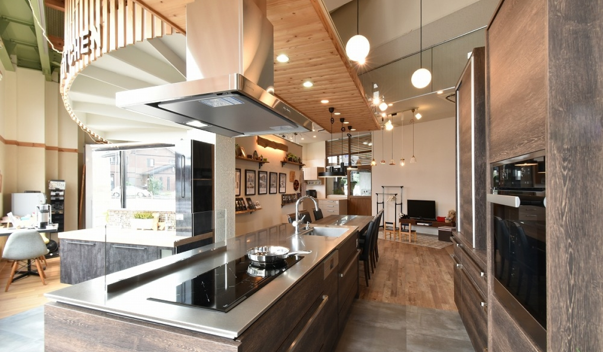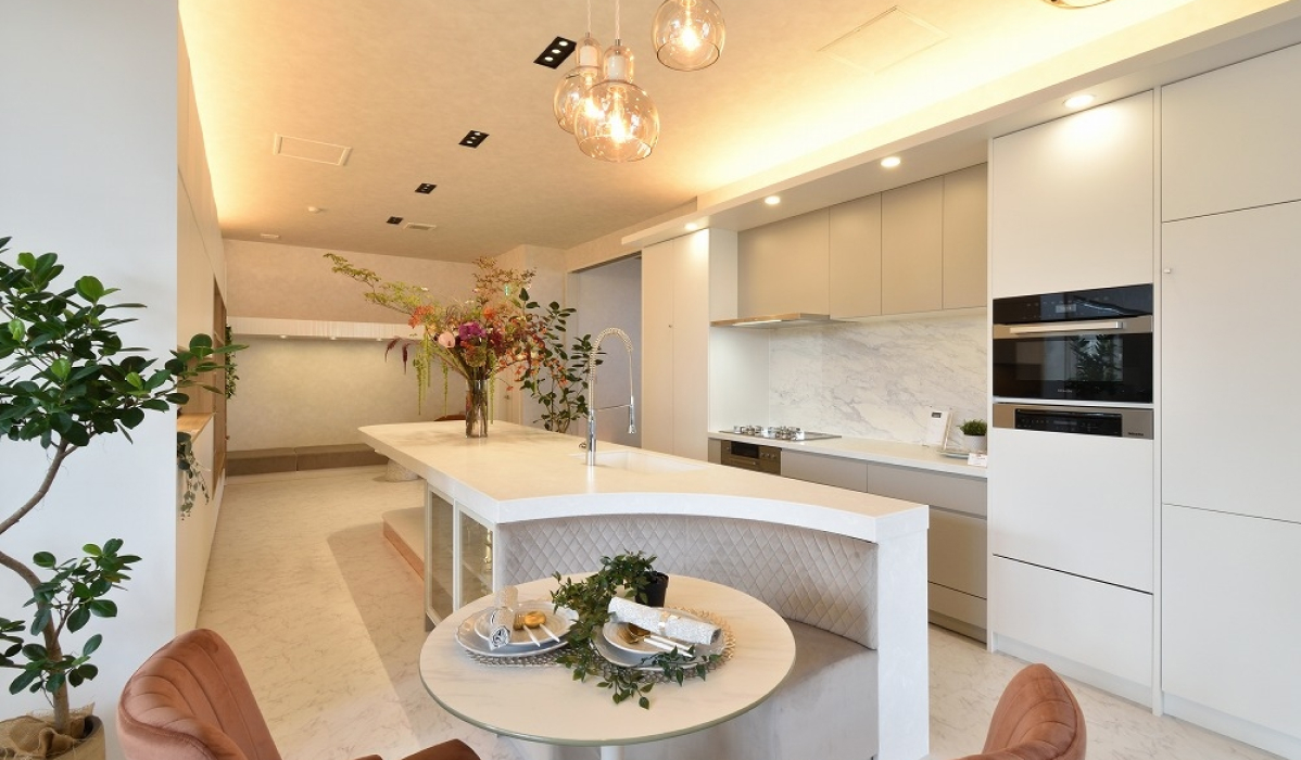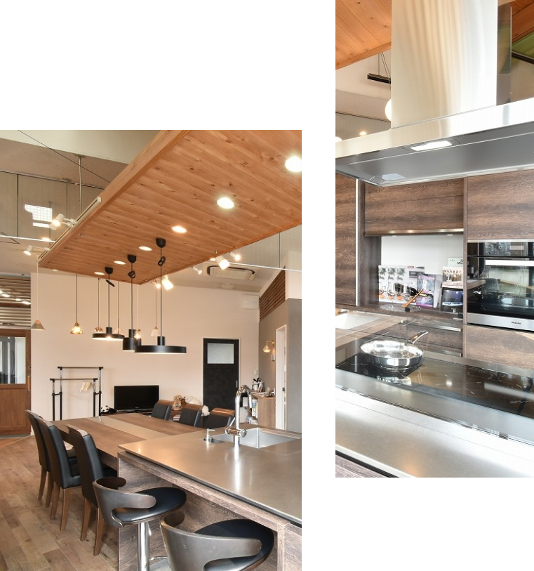 広々としたセンターキッチンは、ダイニングスペースと融合させています。また、ドイツ製ミーレの冷蔵庫や食洗機をビルトインしたカップボードが特徴です。