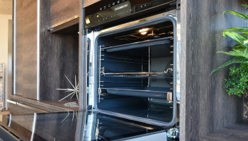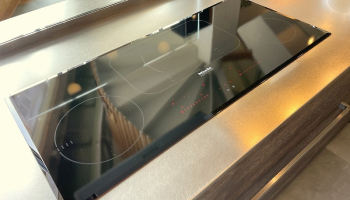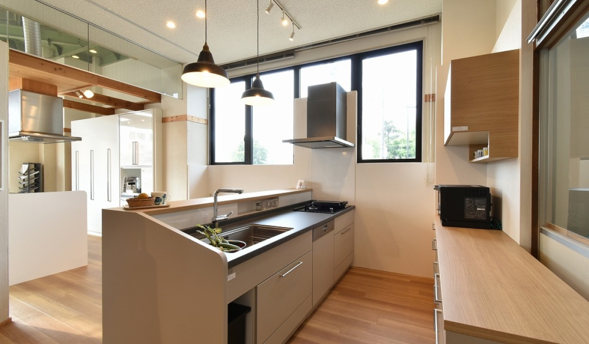食洗機は造作家具へのビルトインだからできる、高さを工夫し使い勝手を重視しました。見た目もかっこいいオーブンは電子レンジ機能付き。冷蔵庫もビルトインすることですっきりスタイリッシュに仕上がりました。