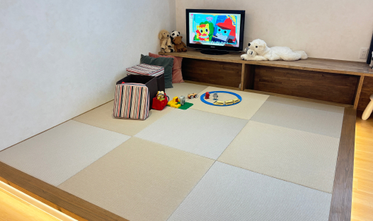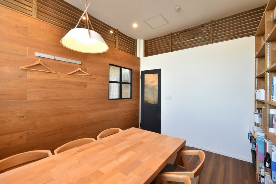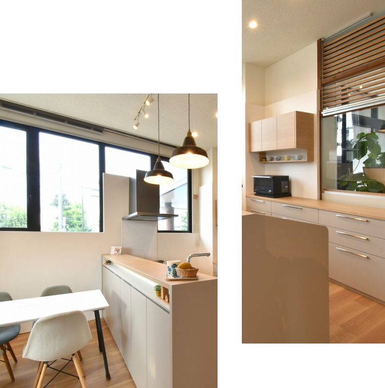 大容量の壁面収納とテレビボードは、オリジナルで造作しています。間接照明で空間を引き立て、キッチンに立つ方が主役になれるような憧れのLDKスペースが完成しました。