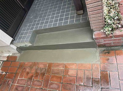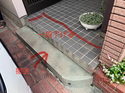 ポーチの階段の一段目を撤去し、2段目手前を一段下げて、