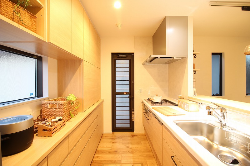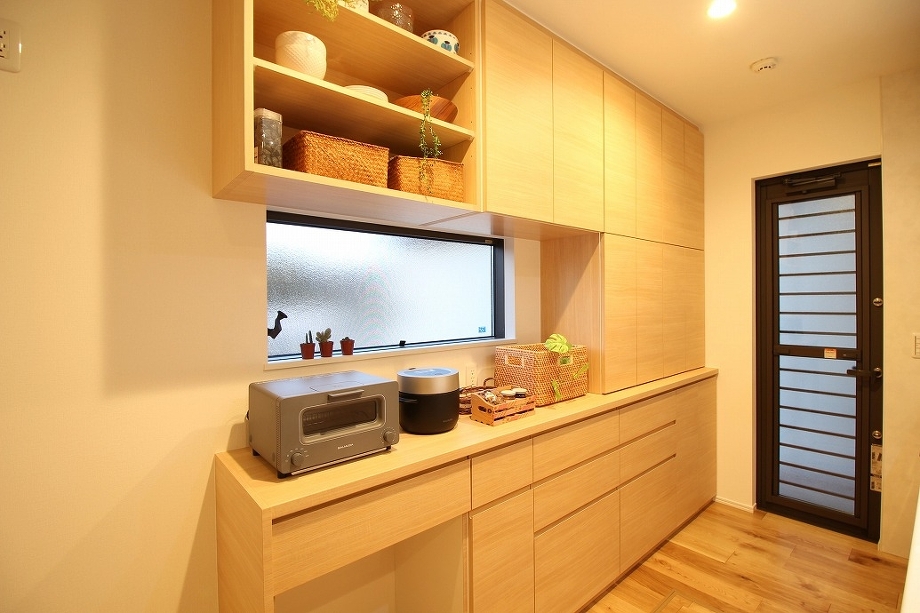 ゴミ箱や米びつを入れるスペース、食品のストック用スペースなど奥様と一つ一つじっくり考えました。