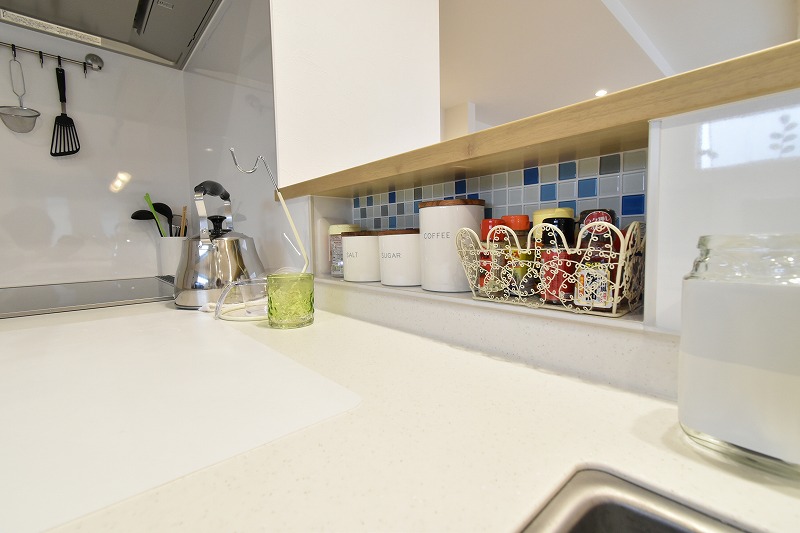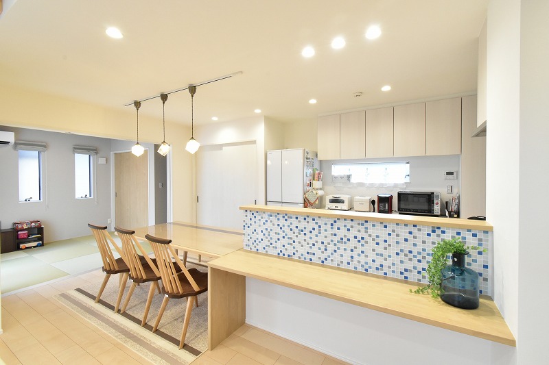 リビング側には可愛らしいブルーのモザイクタイルを採用。お部屋のアクセントにもなっています。