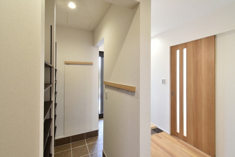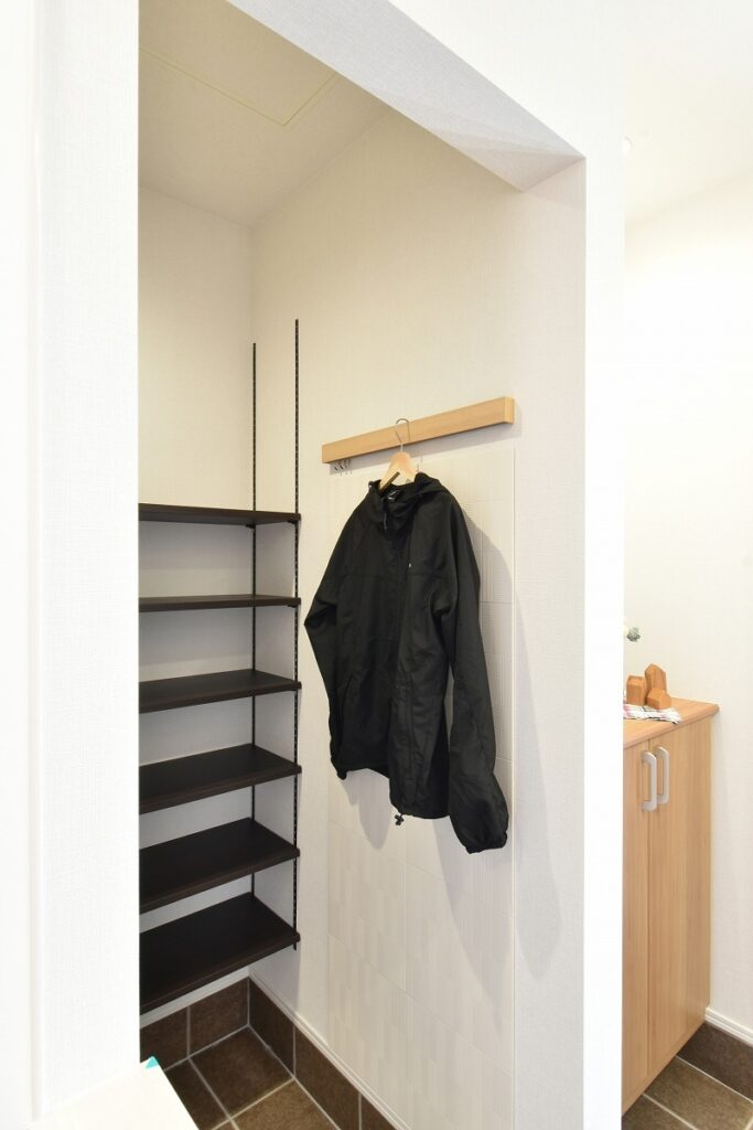 こちらにもハンガー掛けを設置しており、上着やペットのお散歩用品なども掛けておけそうです。