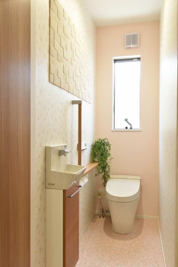 正面の壁にはお施主様がお好きなピンク色のクロスで仕上げ、大人かわいいスペースとなりました。