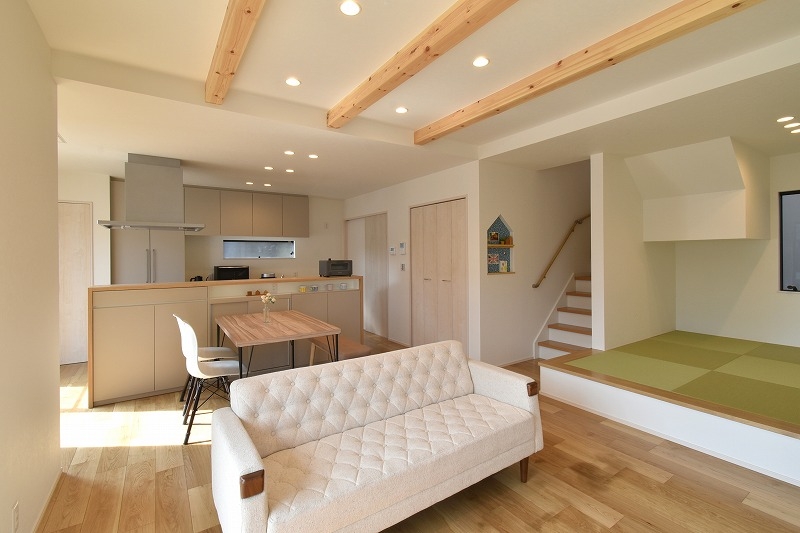 室内はナチュラルなインテリアを目指し、天井の化粧梁で木質感を演出しました。