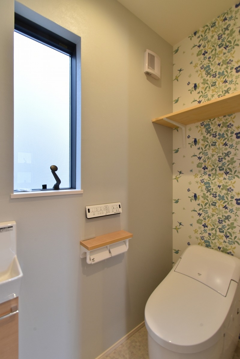 背面にはモザイクタイルのような柄のアクセントクロスを採用しました。