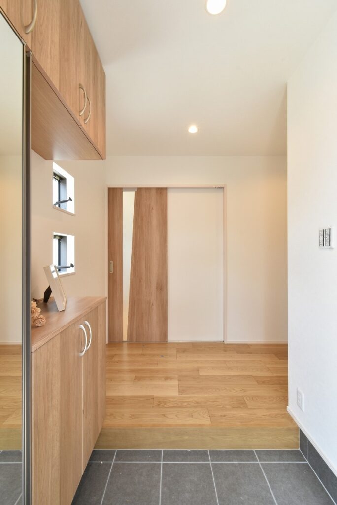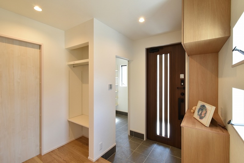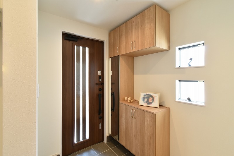2つの縦すべり窓や、玄関ドアのスリットから光が入り明るい玄関ホールです。