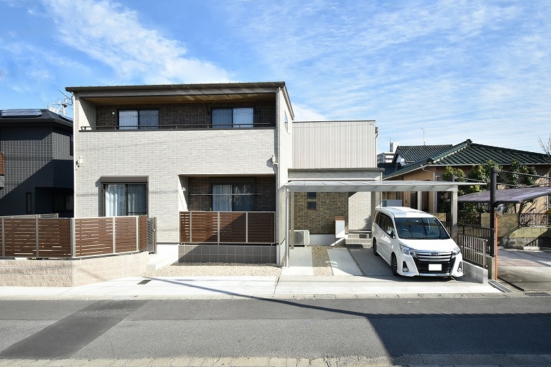 グレーベースにブラウンタイルのサイディングがアクセントとなった、飽きのこないベーシックな雰囲気の外観。