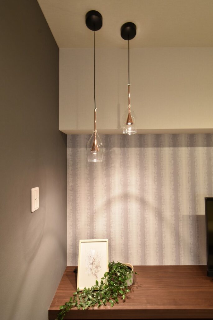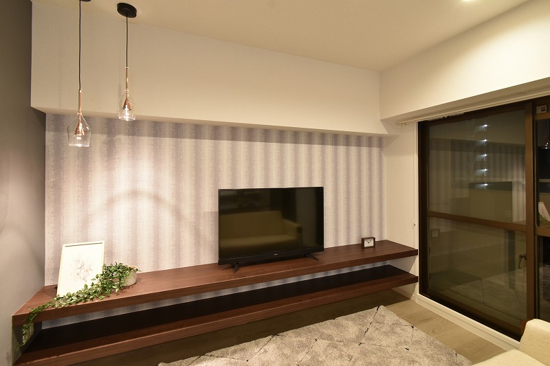 TVボード背面のアクセントの柄クロスも色味を合わせて上品にまとめました。