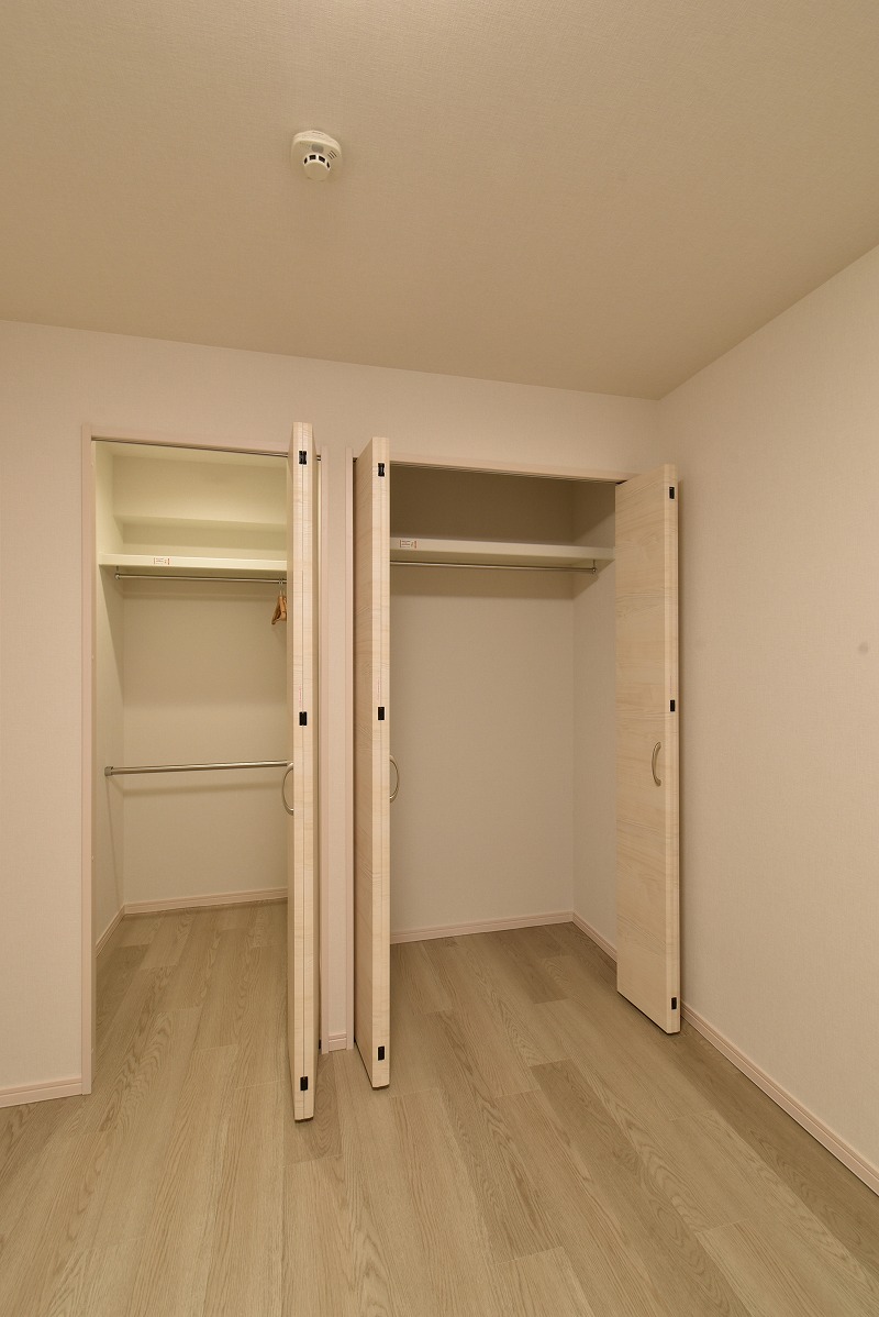 写真左側の収納は枕棚とパイプハンガーを上下2本つけた少し広めのクローゼットになっています。