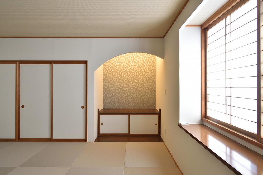 垂れ壁は半円を描き、間接照明を設置し優しく照らします。