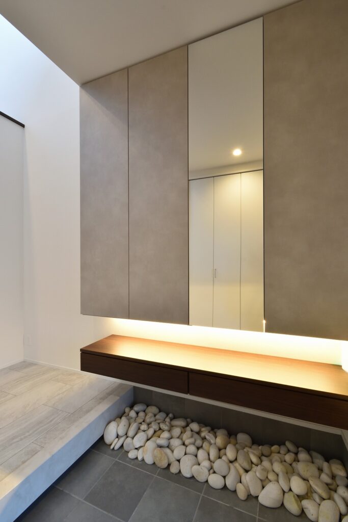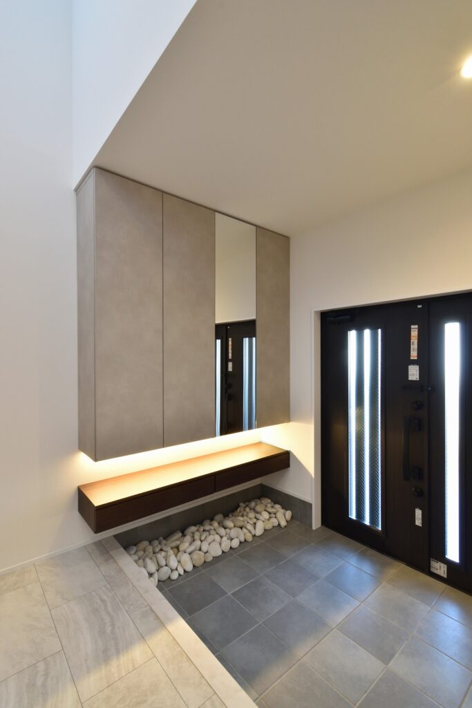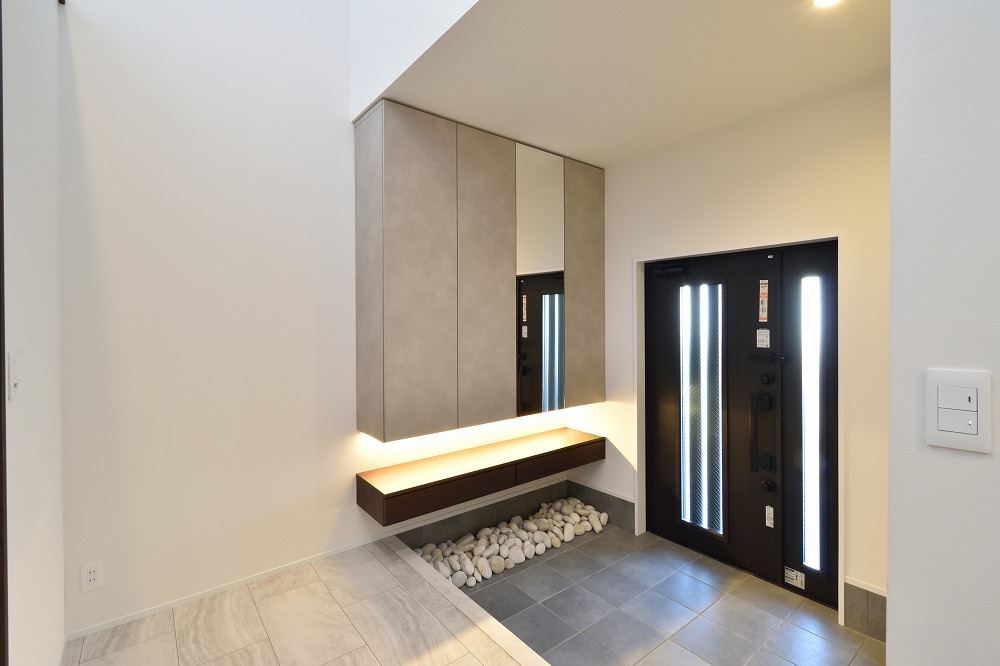 大型収納のトールキャビネットと、引出しカウンターを組み合わせた玄関収納。