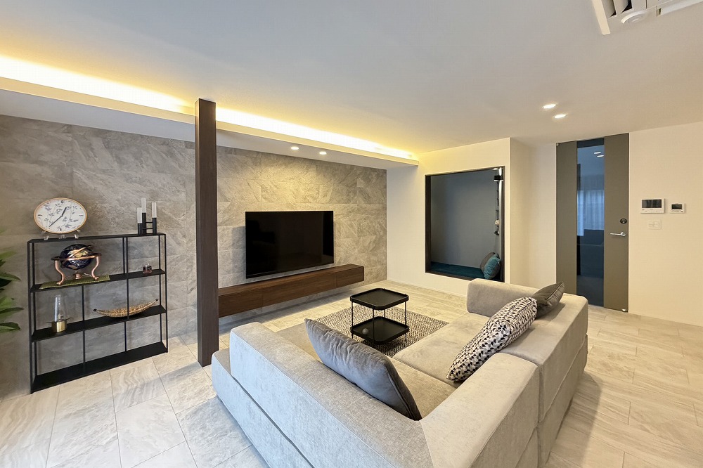 テレビボードはフロートタイプ、背面の壁にはエコカラット「マジェスティックスレート」グレー色を採用しております。