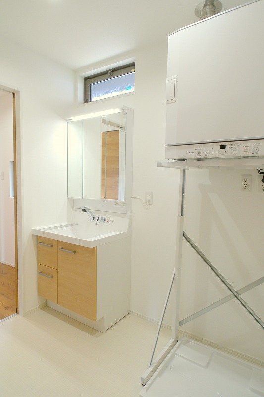 洗面室にはガス乾燥機を設置したので、洗濯物はしっかり乾くし、そのまま洗面室の棚に収納するので、部屋が洗濯物で散らかることがありません。妻が棚の仕分けボックスに、アイテム別にラベルを付けてくれたので、いちいち聞かなくても間違えずにしまうことができます(笑)。