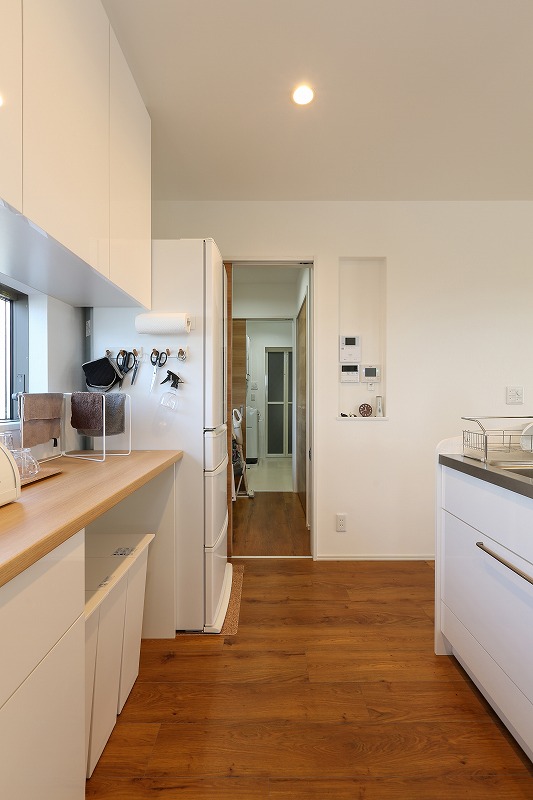 ご主人様:キッチン→パントリー→洗面室と続く、直線ラインの家事動線です。真っすぐ短い距離で移動できるので無駄がないですね。